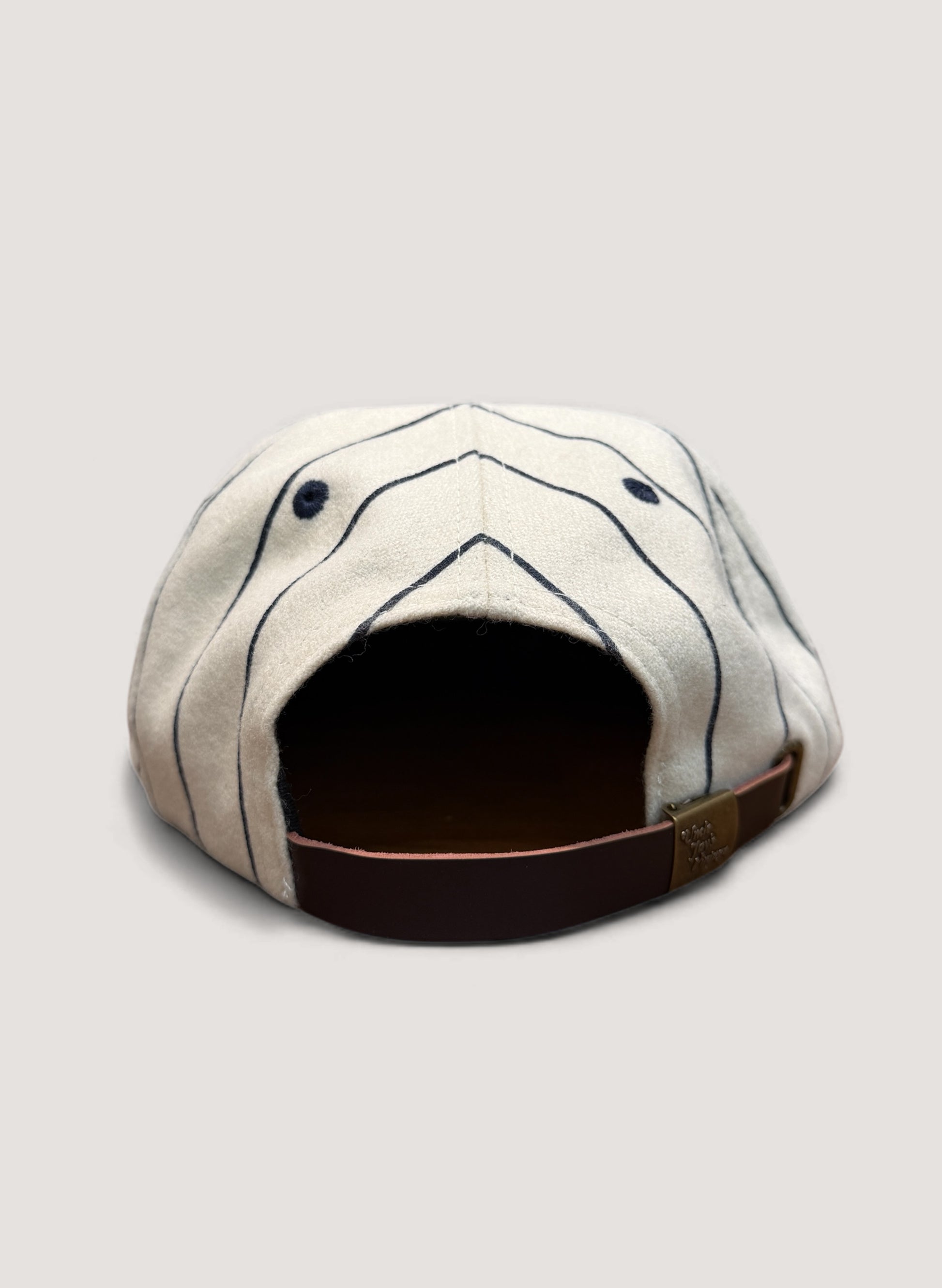 とにかく形が良く、PIN STRIPEプリントのWOOL素材を使用し、フロントのNY LOGOがチェーンステッチ、ベルト部分にはPU素材(フェイクレザー)、アジャスターの金具部分にはSHOP LOGOオリジナル刻印も施されております。