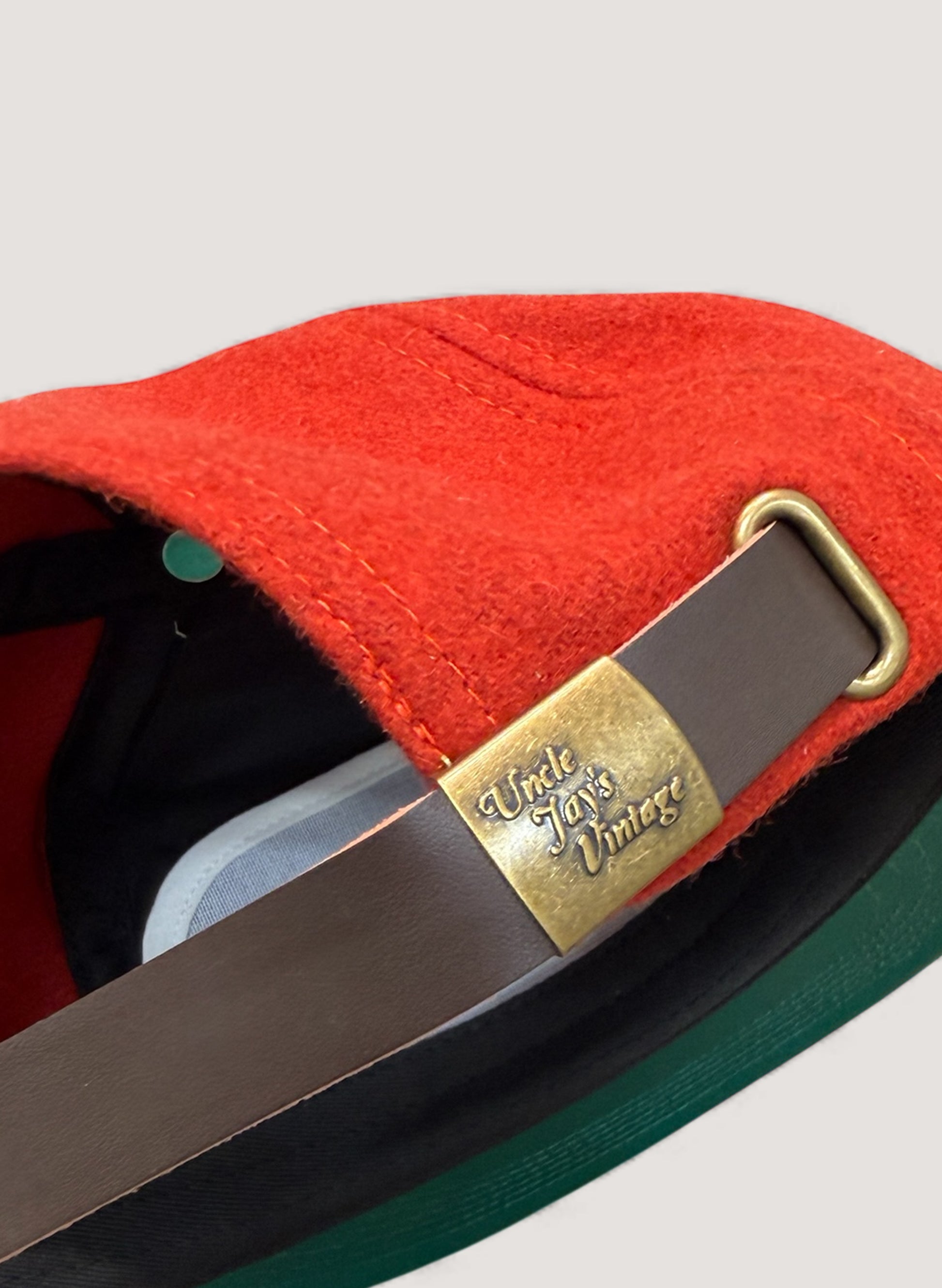 とにかく形が良く、WOOL素材を使用し、フロントのNY LOGOがFELT PATCH、左サイドにはUncle Jay's Vintageの刺繍、ベルト部分にはPU素材(フェイクレザー)、アジャスターの金具部分にはSHOP LOGOオリジナル刻印も施されております。