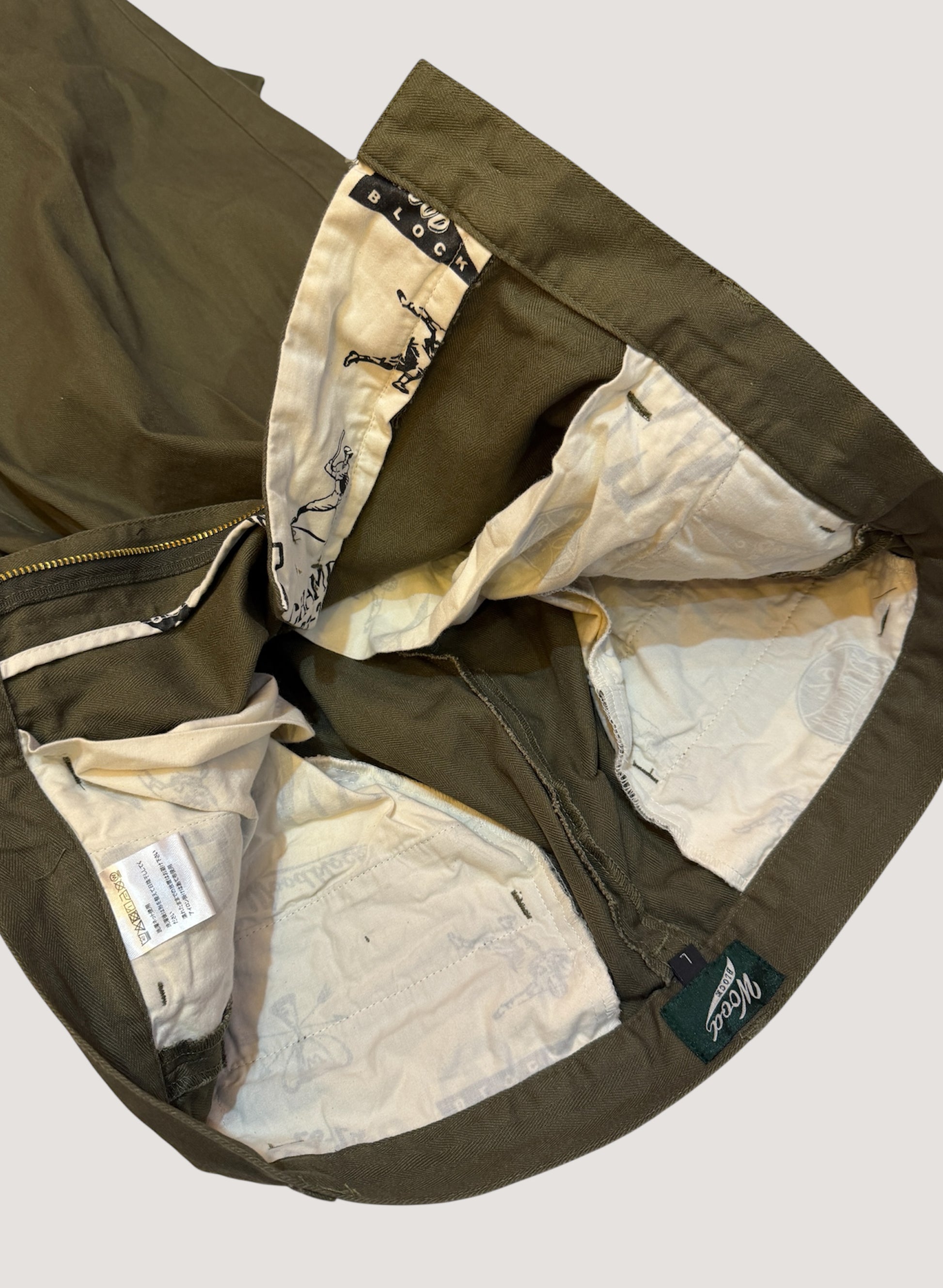 ポケットの内側には総柄プリントを施した生地を採用、ヒップポケット上のBRAND LABELなど一見シンプルながら、WOODBLOCKらしさも演出したデザイン。