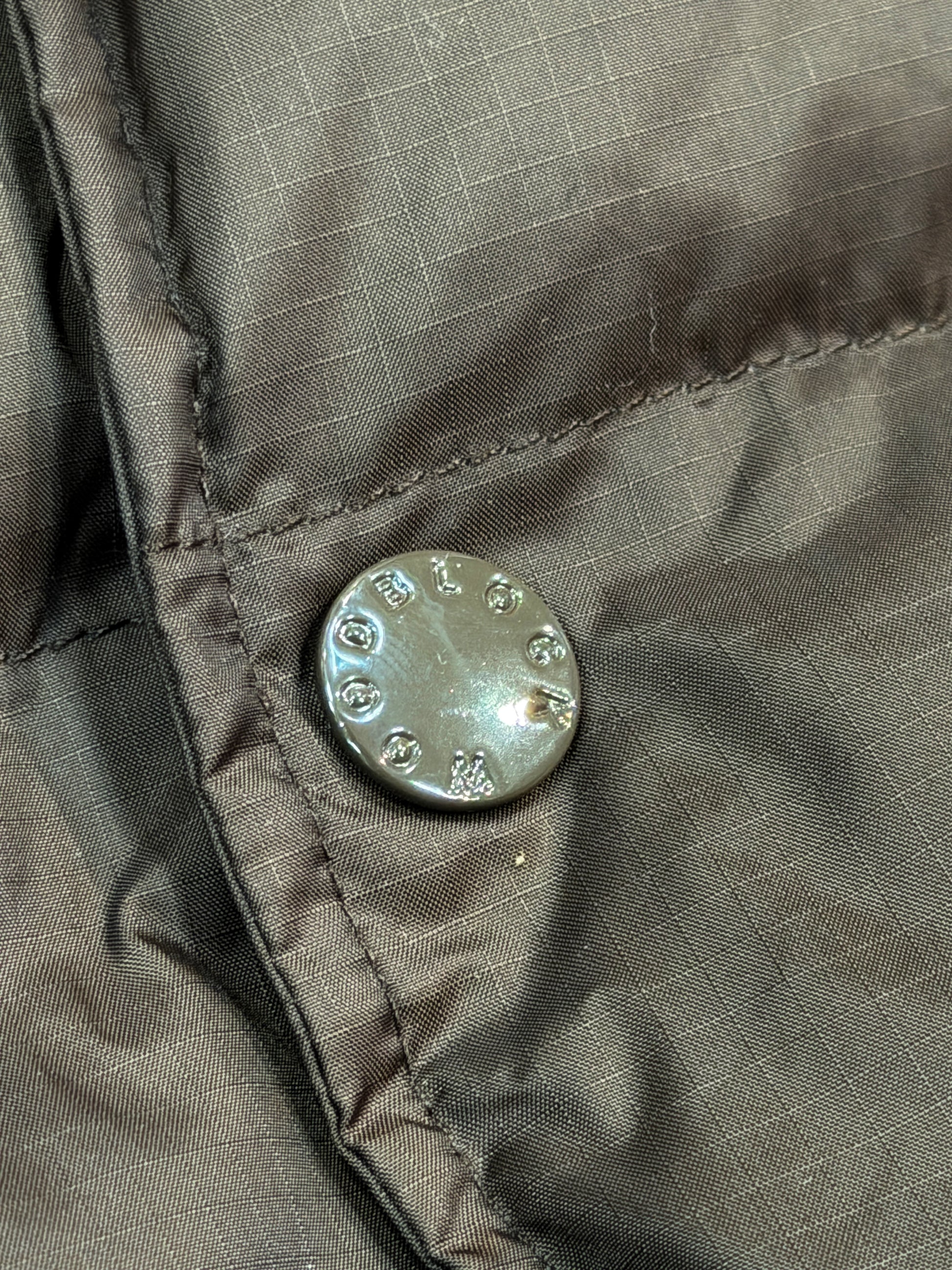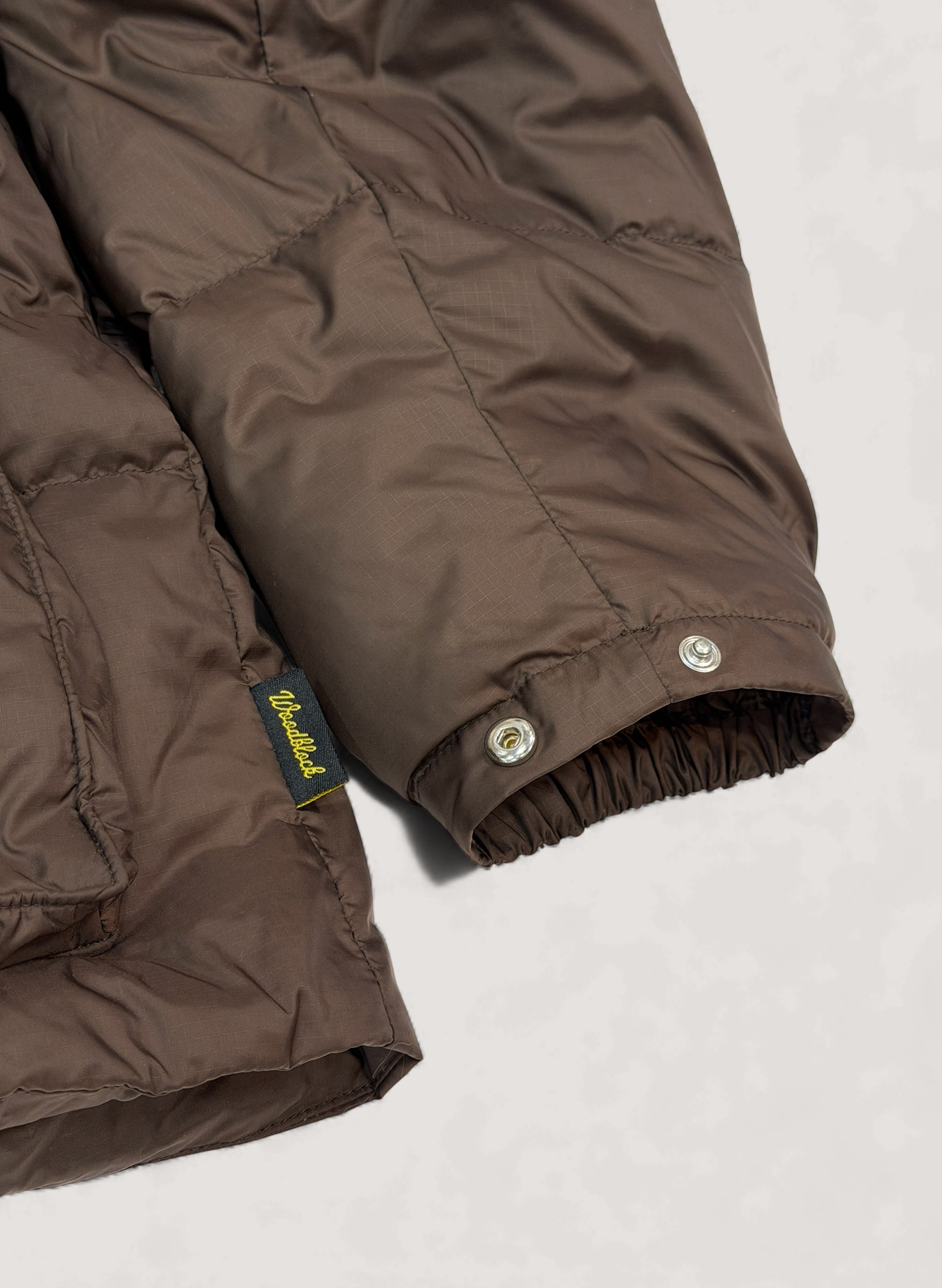 WOODBLOCK刻印入りオリジナルスナップボタン、ダブルジップ仕様、袖口にもスナップボタン付き。